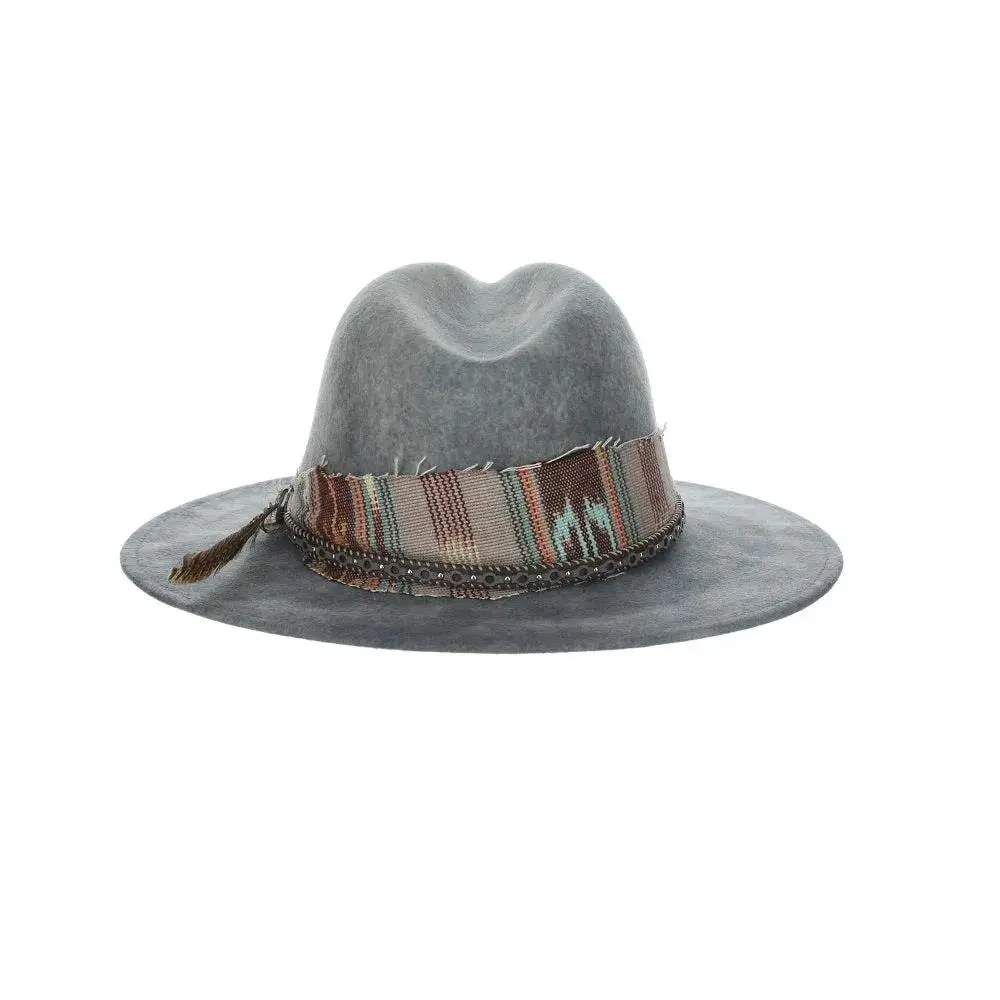 Designed for the maximalist, the Tepa wide brim hat has a lot to offer. Constructed with cloud pattern wool felt and a multi-layer Southwest fabric band with studs and a feather, this hat puts it all out there. If that sounds like you, sign on up and add this special hat to your cart.