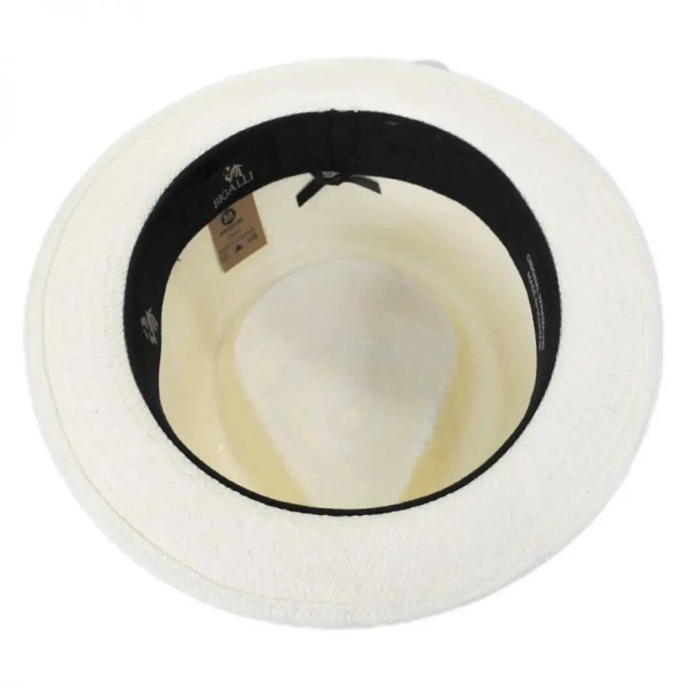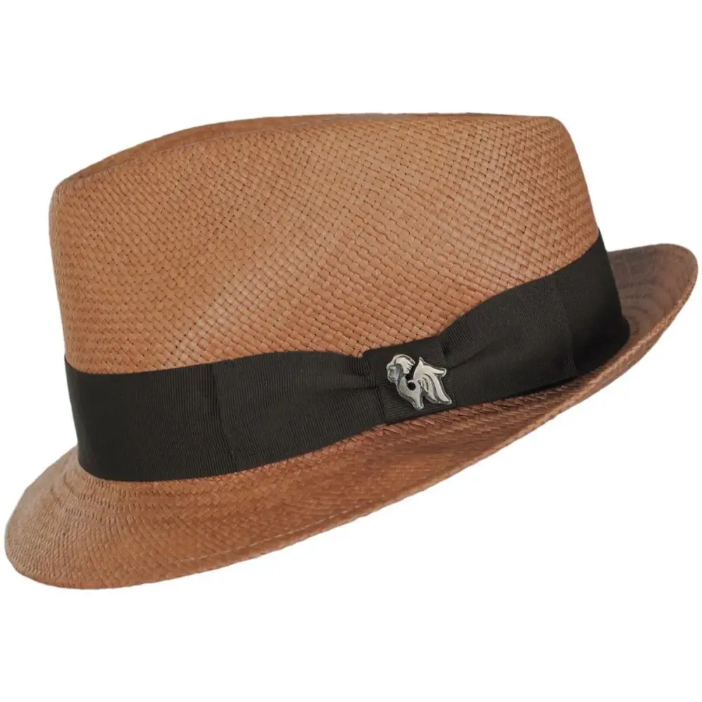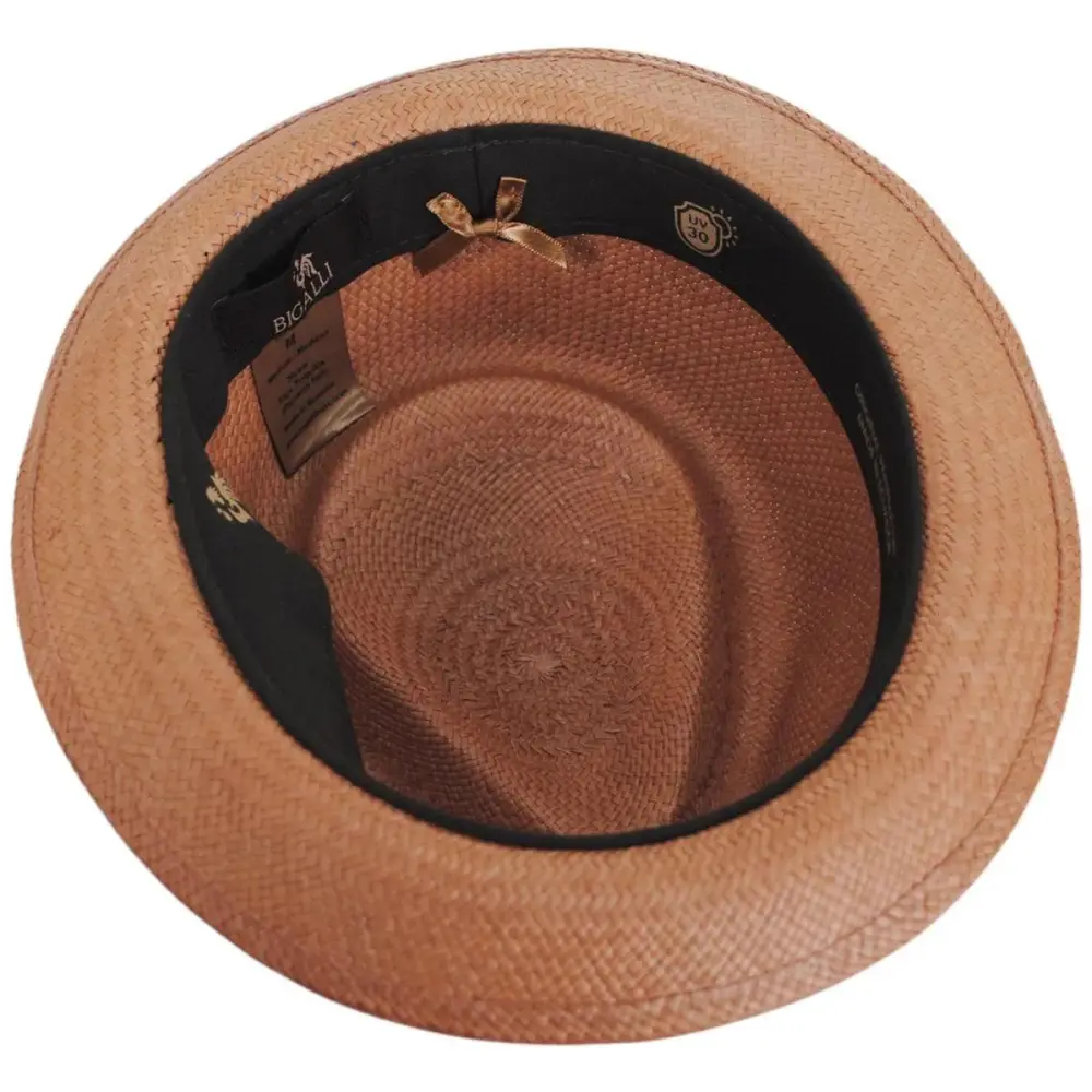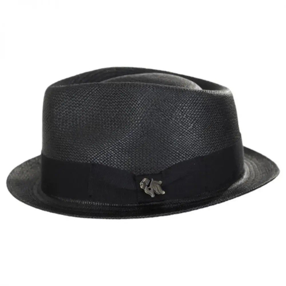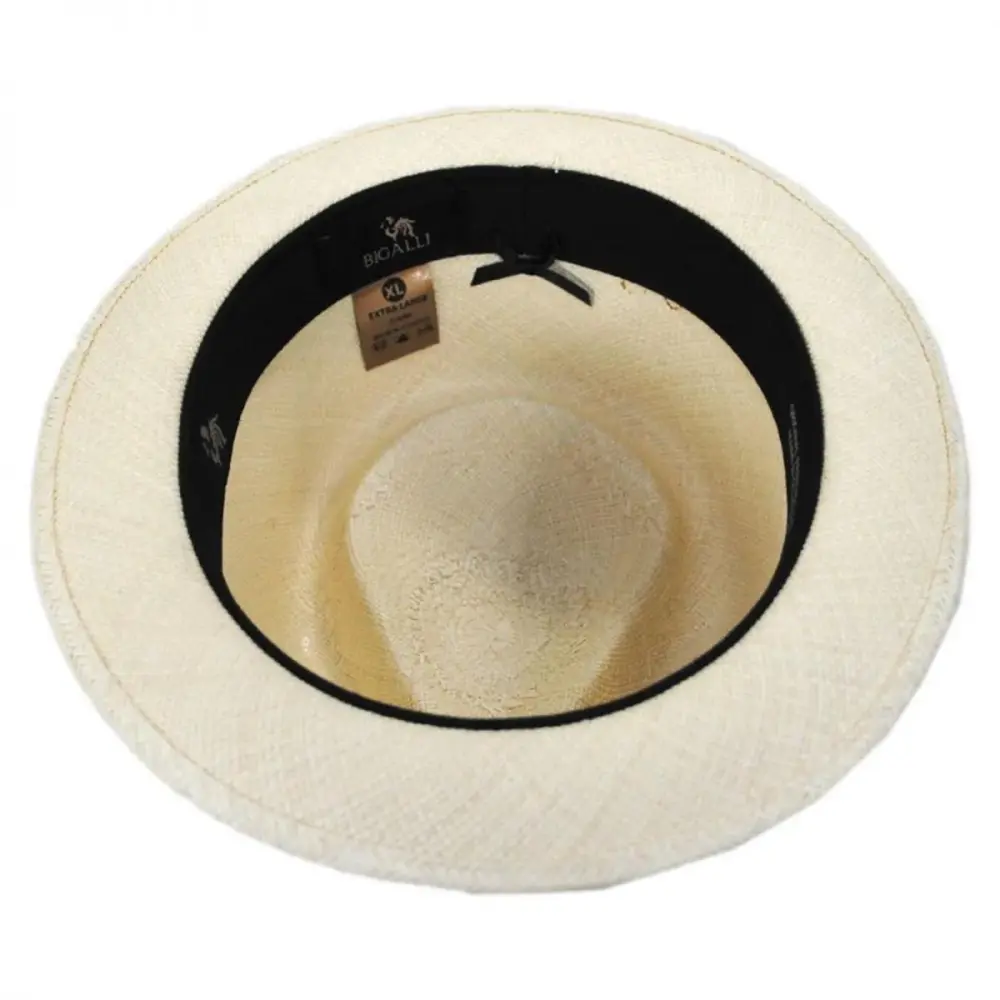 Bigalli's sleek Boston Panama Straw Trilby Fedora Hat features a modern and smaller-profile fedora design ideal for both men and women. Enjoy the unparalleled look of a handwoven and handcrafted panama hat in a hip and trendy fedora style! The Boston is blocked with a classic teardrop crown and stingy (narrow) brim. Trims are kept classic and minimal and include a black grosgrain ribbon hat band with side bow and Bigalli logo side pin.