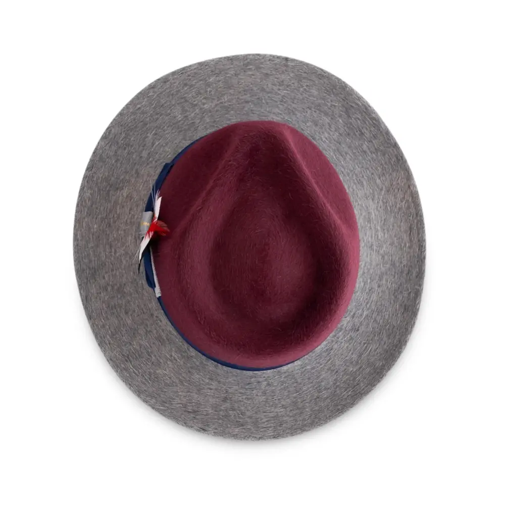 The Fox Fedora in Two Tone Burgundy/Gray is a stylish and sophisticated choice for any occasion. Made with long hair finish, this hat features a Burgundy Crown and Gray brim, accented with a royal blue ribbon and feather. Stamped with the Bellissimo logo that stands for quality and style. Finished with a leather sweatband and blue satin lining, this fedora is sure to make a statement.