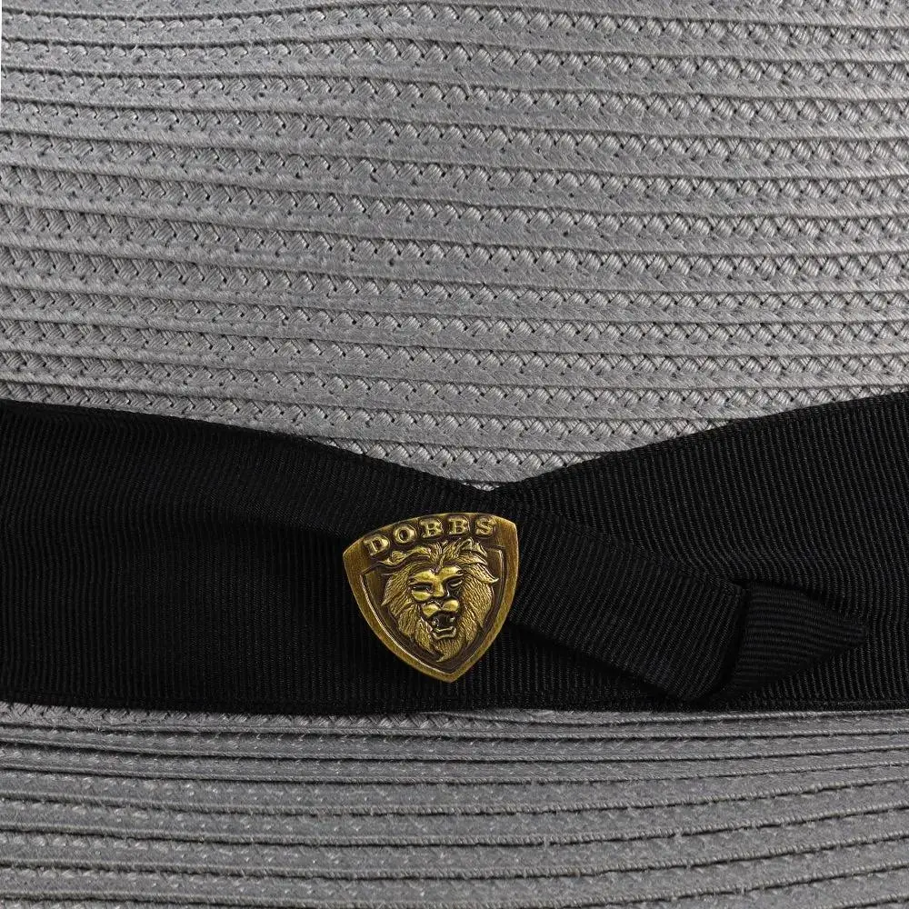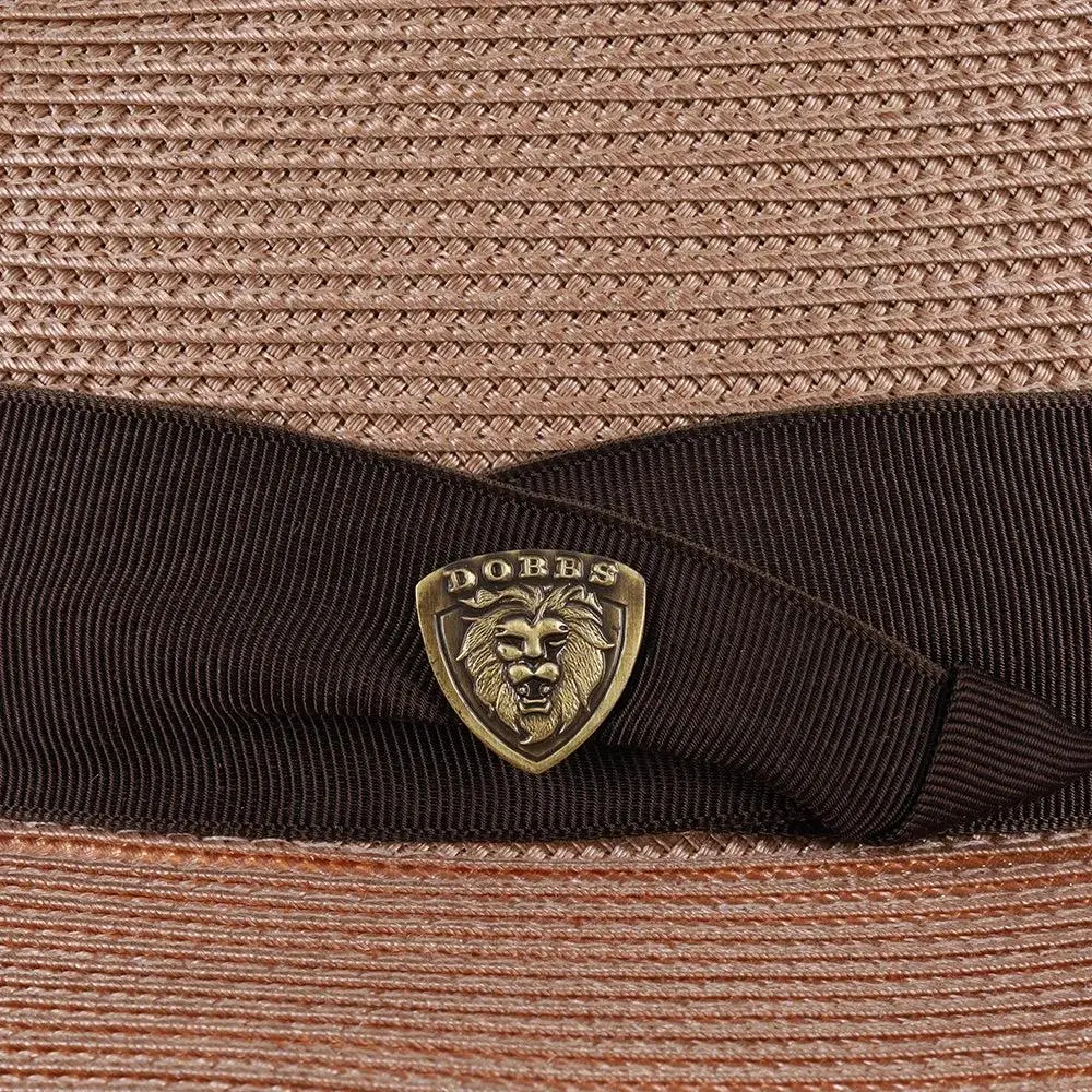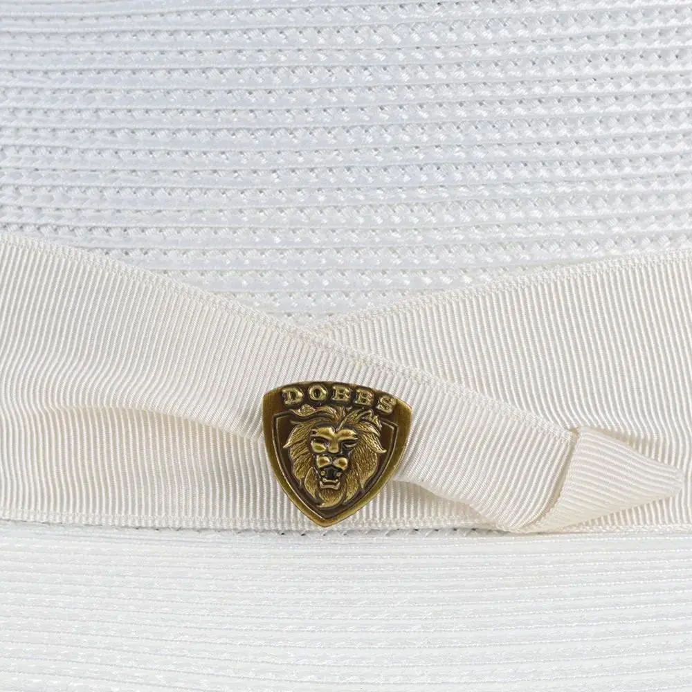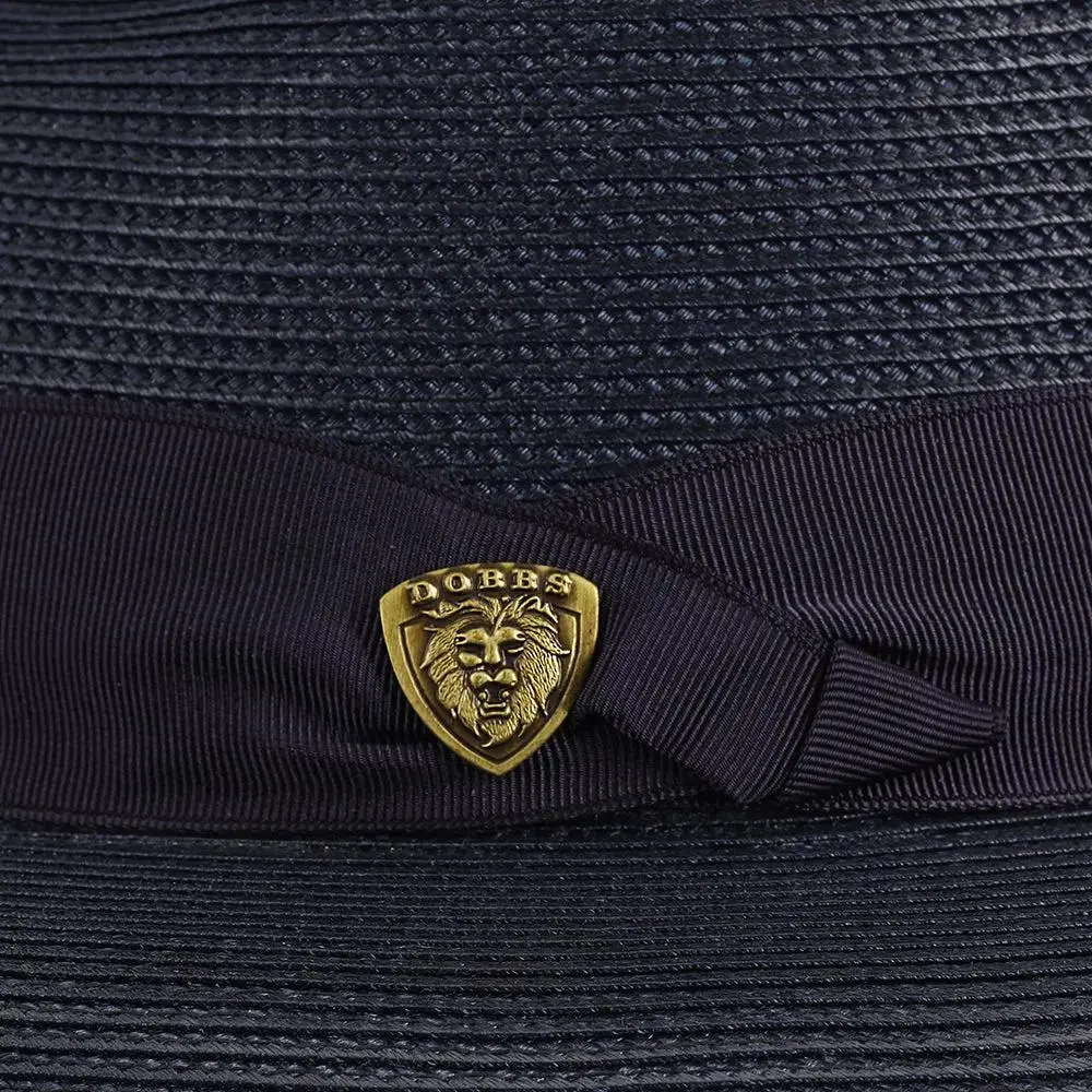 The fedora is made with Florentine Milan straw, which is lightweight and breaths easily. It also features a leather sweatband, center dent crown and a 2.5" brim that is situated below a satin band with a Dobbs hatpin featuring a lion's head.