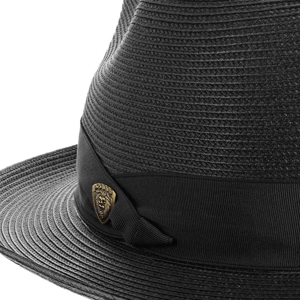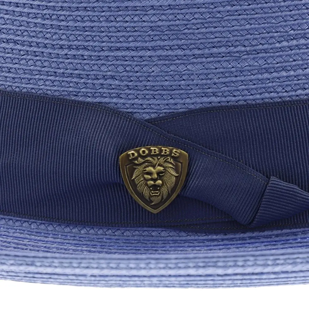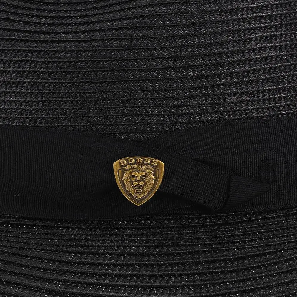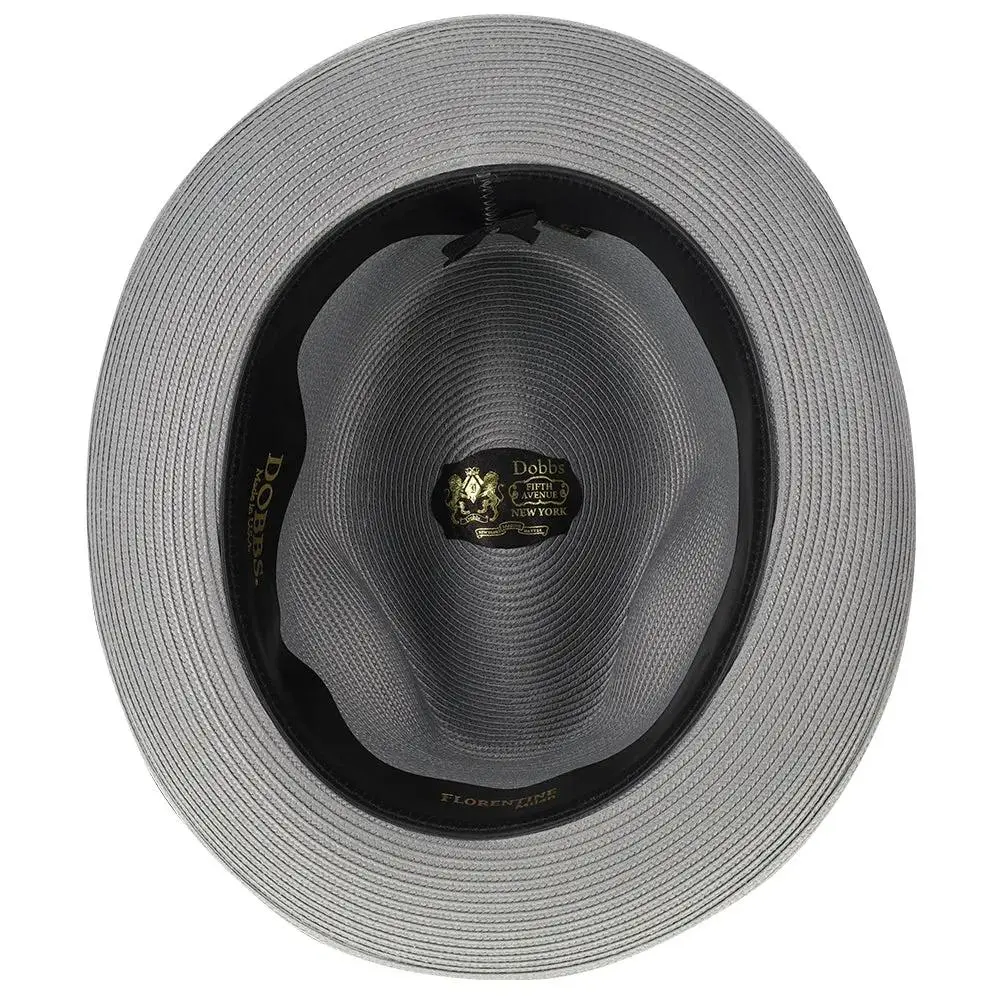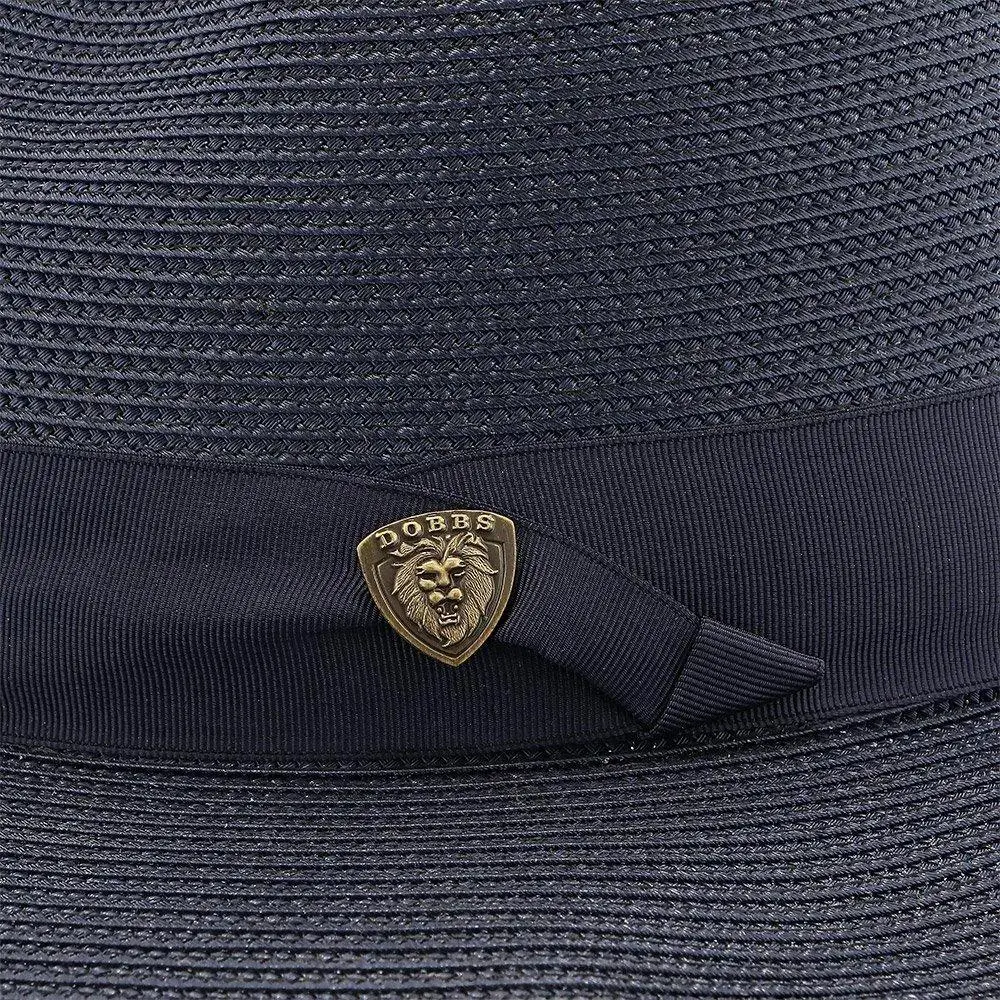 The fedora is made with Florentine Milan straw, which is lightweight and breaths easily. It also features a leather sweatband, center dent crown and a 2.5" brim that is situated below a satin band with a Dobbs hatpin featuring a lion's head.