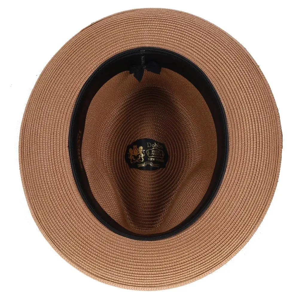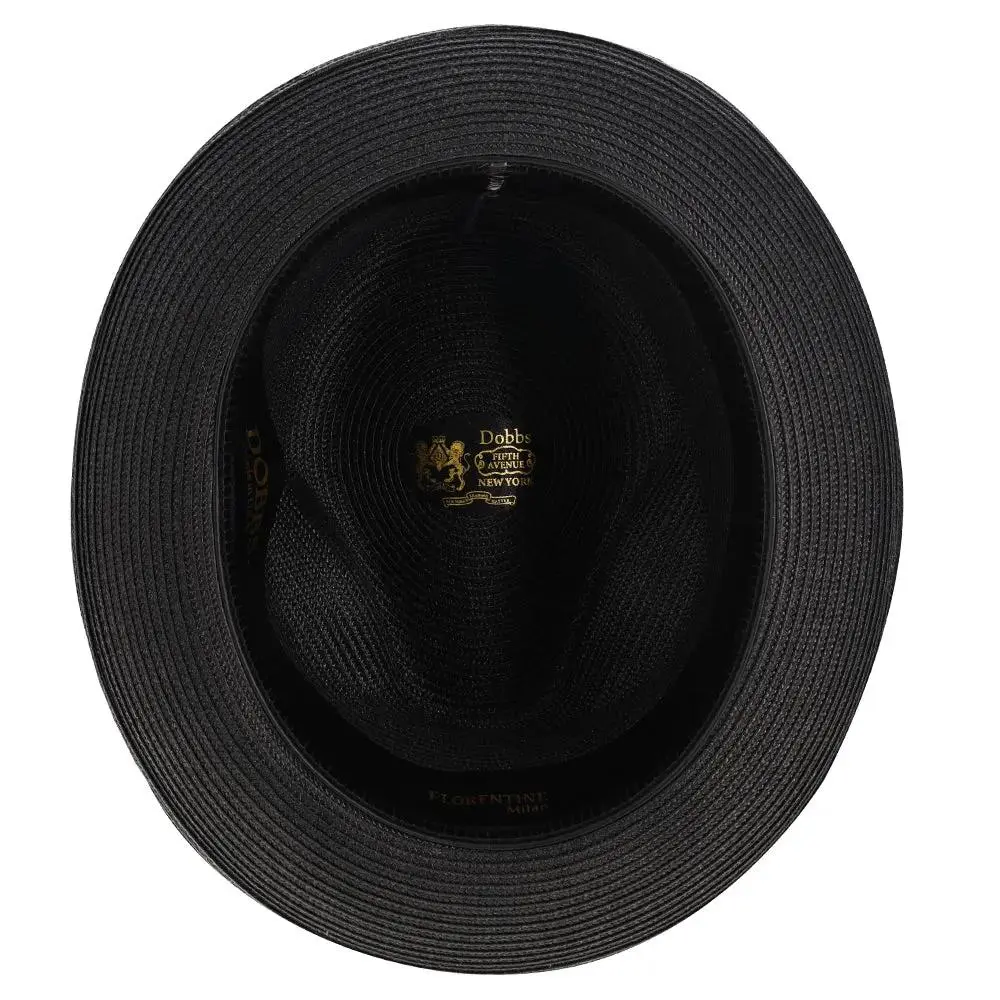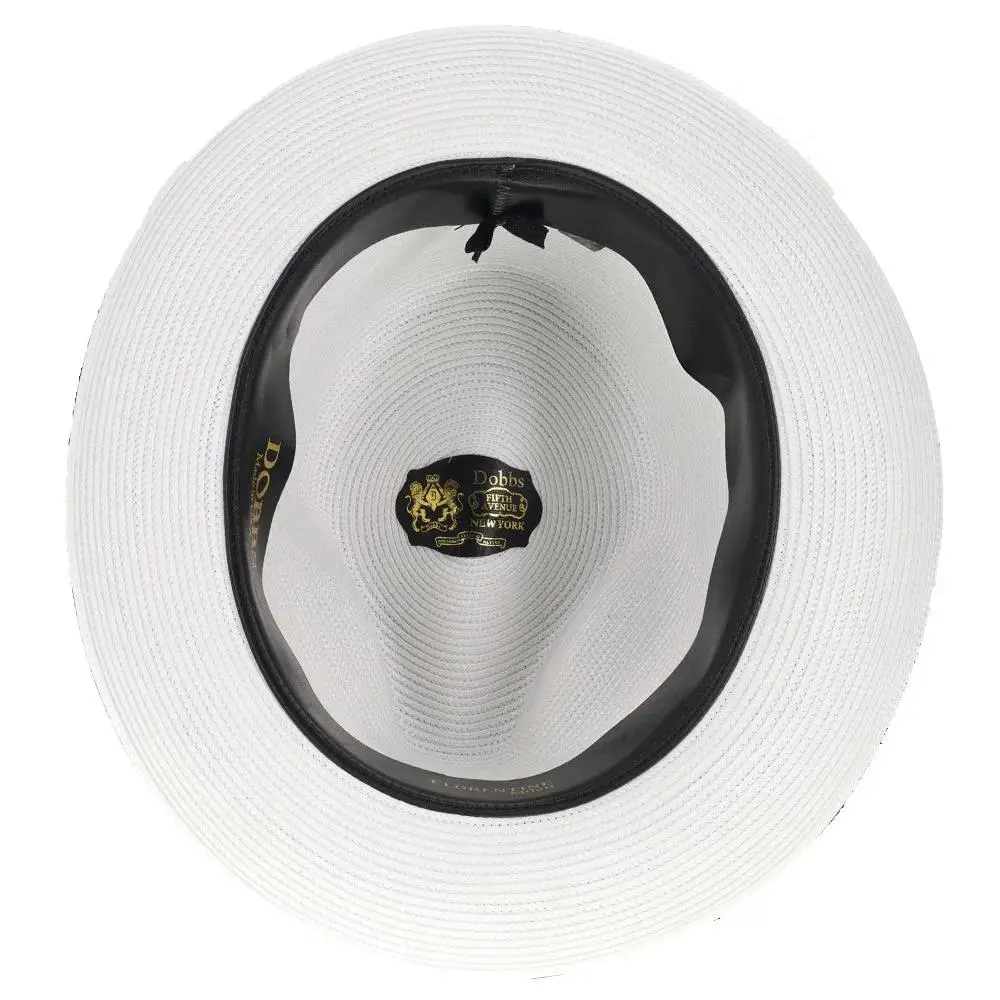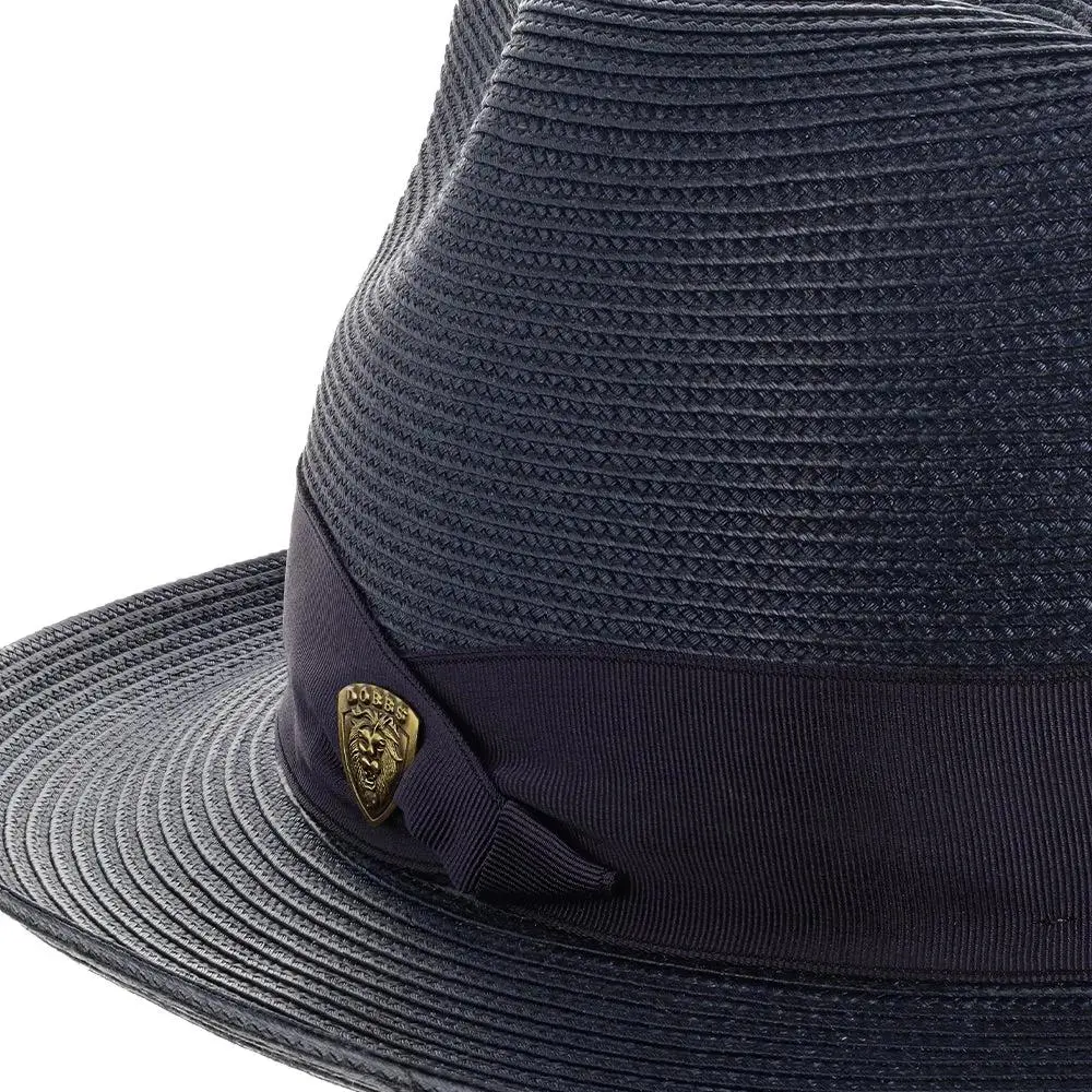 The fedora is made with Florentine Milan straw, which is lightweight and breaths easily. It also features a leather sweatband, center dent crown and a 2.5" brim that is situated below a satin band with a Dobbs hatpin featuring a lion's head.