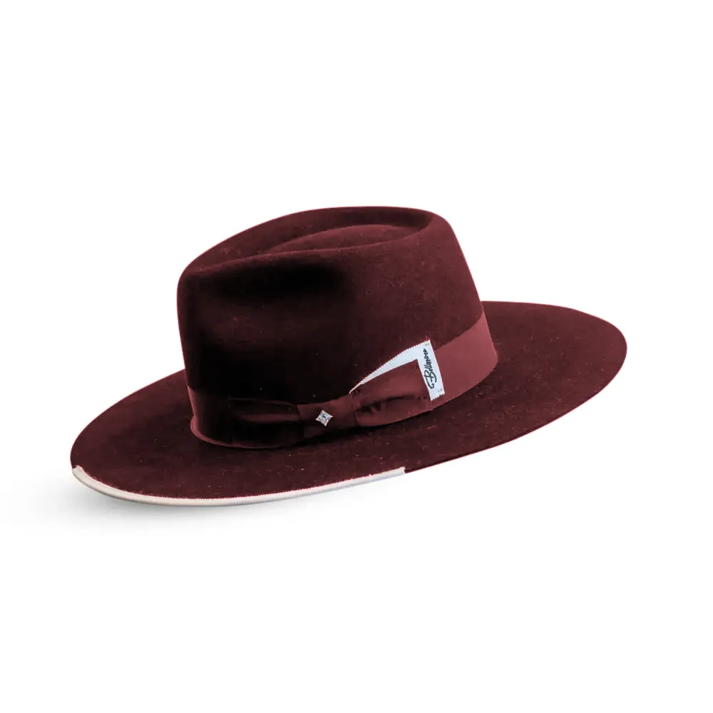 The limited edition Wine Red and White Stud by Bellissimo Hats is a one-of-a-kind wide-brimmed fedora accented with a sparkling stud on the bow. Not only is the Wine Red Stud a rare find for hat collectors, but it is also one of the best all-around fedoras for fashionable consumers. If you’re looking for a dramatic look, we offer the Black and white (black body, white ribbon, and white trim). Alternatively, if you want to add a pop of color to your hat, we also have the Black on Burgundy version (black body, burgundy ribbon, and trim). Either way, the Black Stud comes in a wide range of sizes.