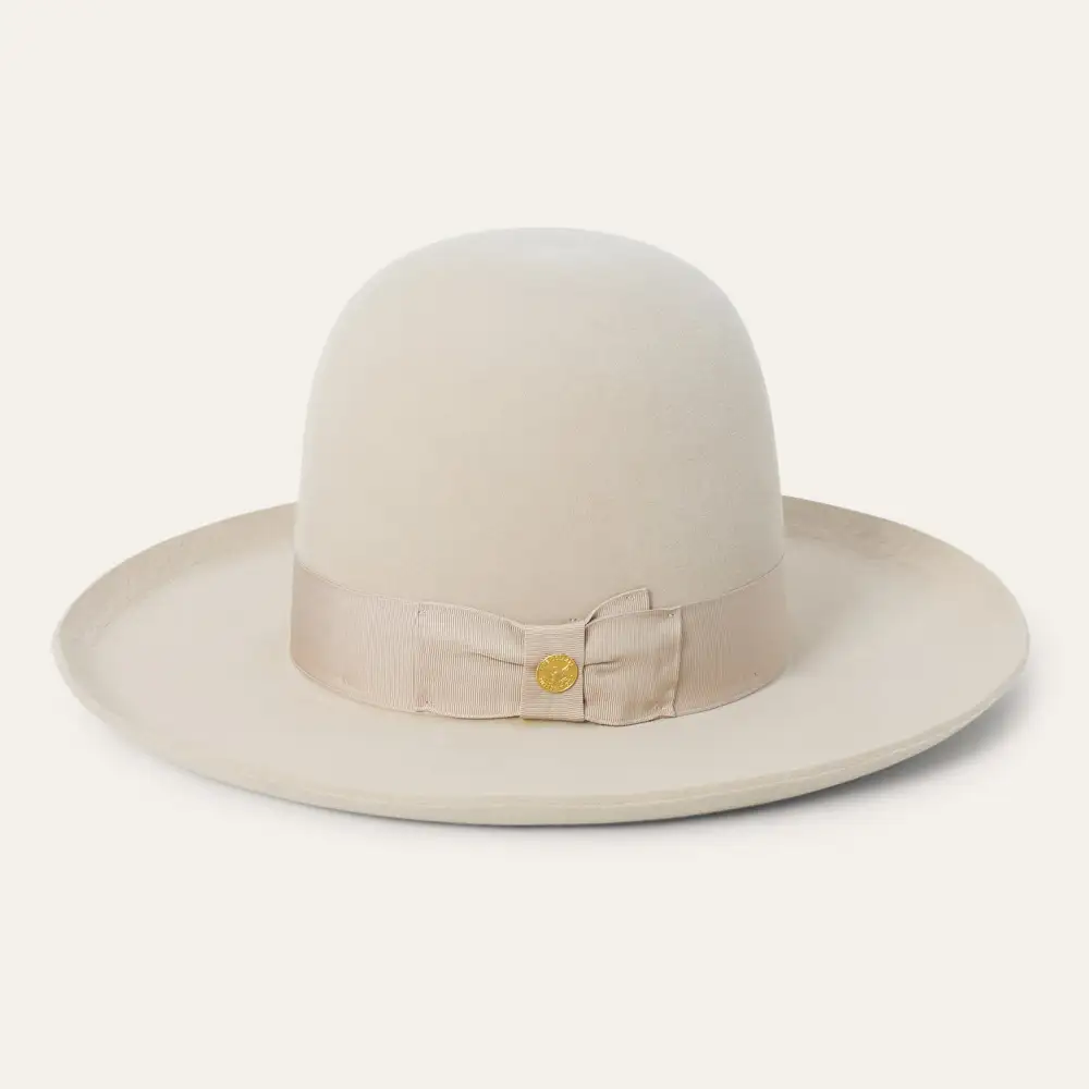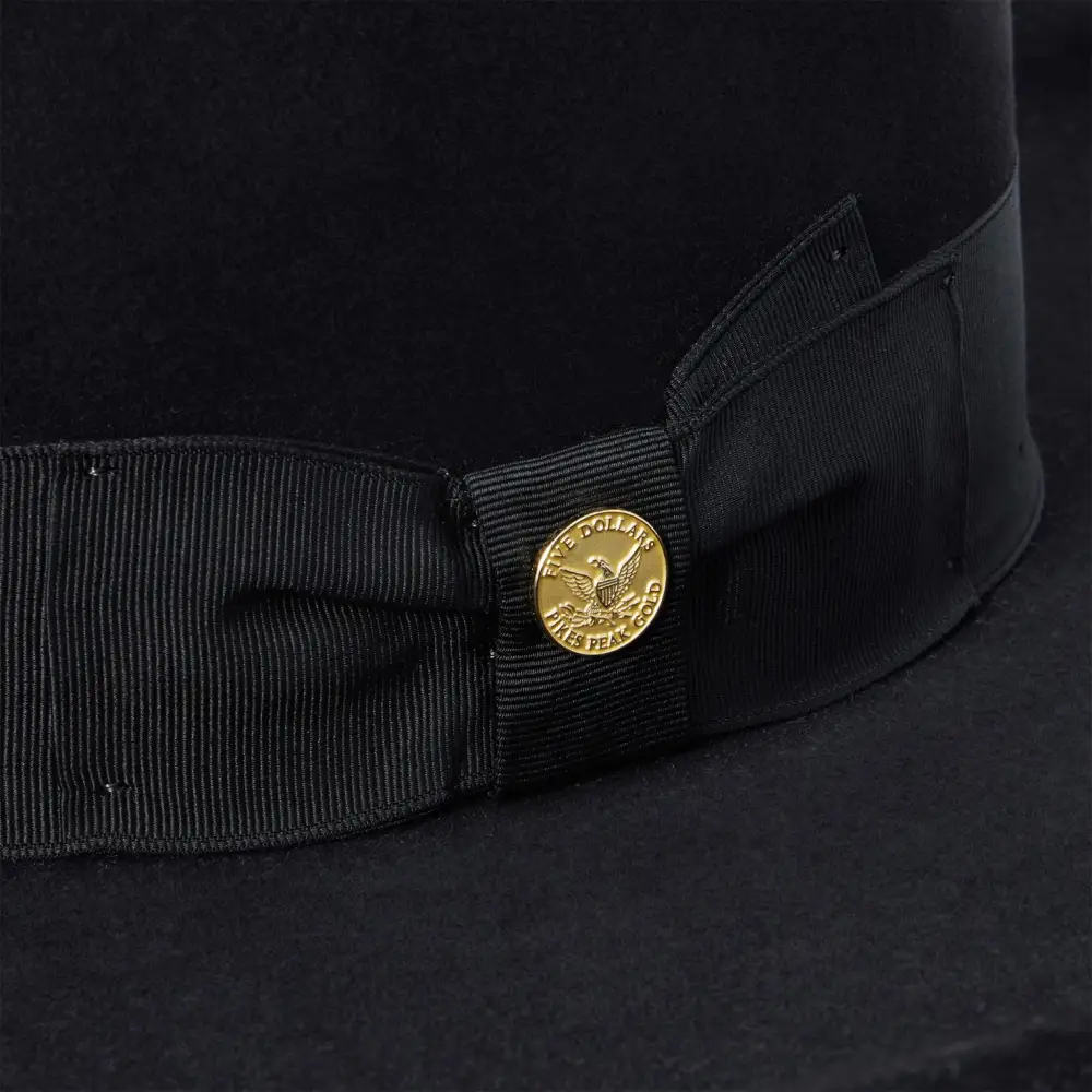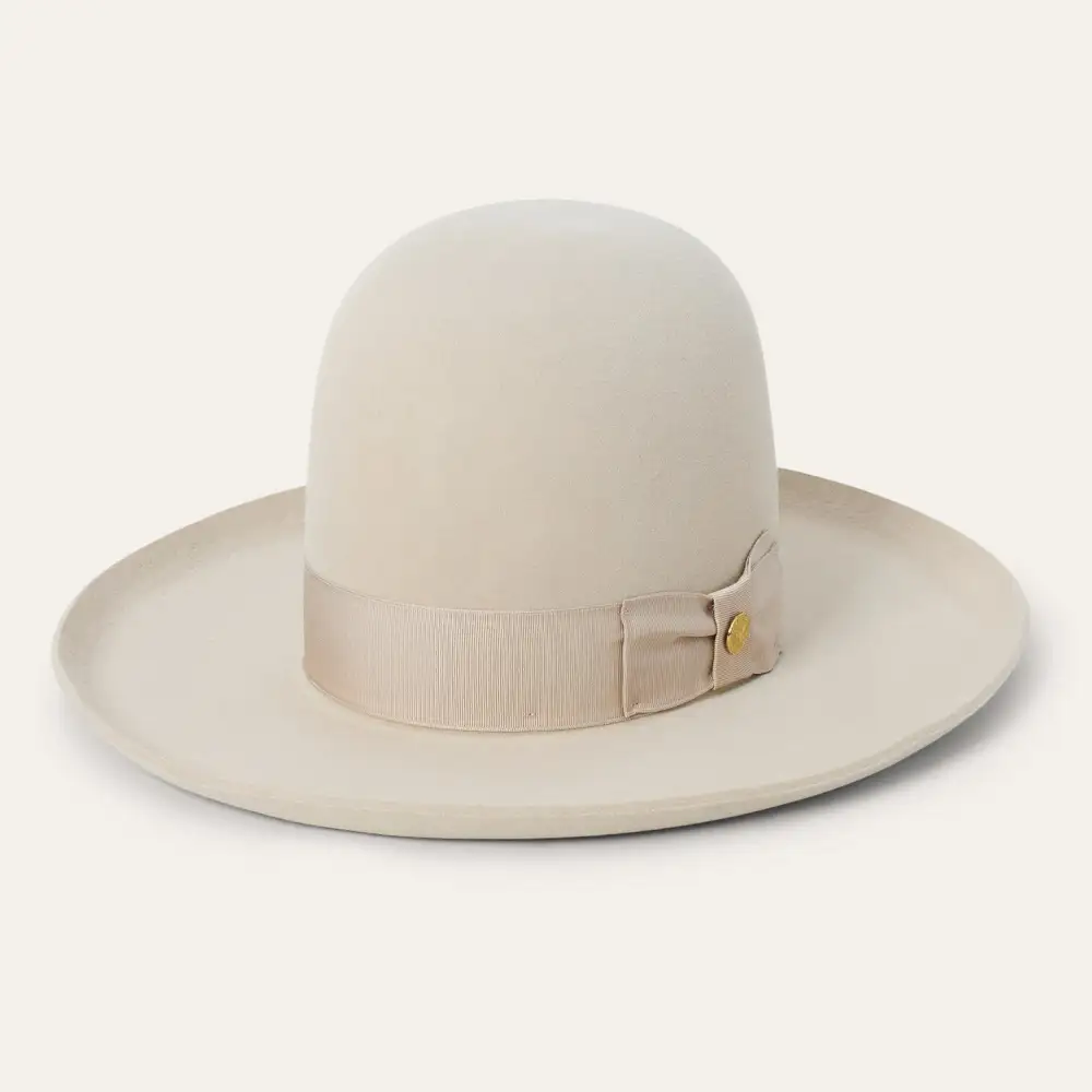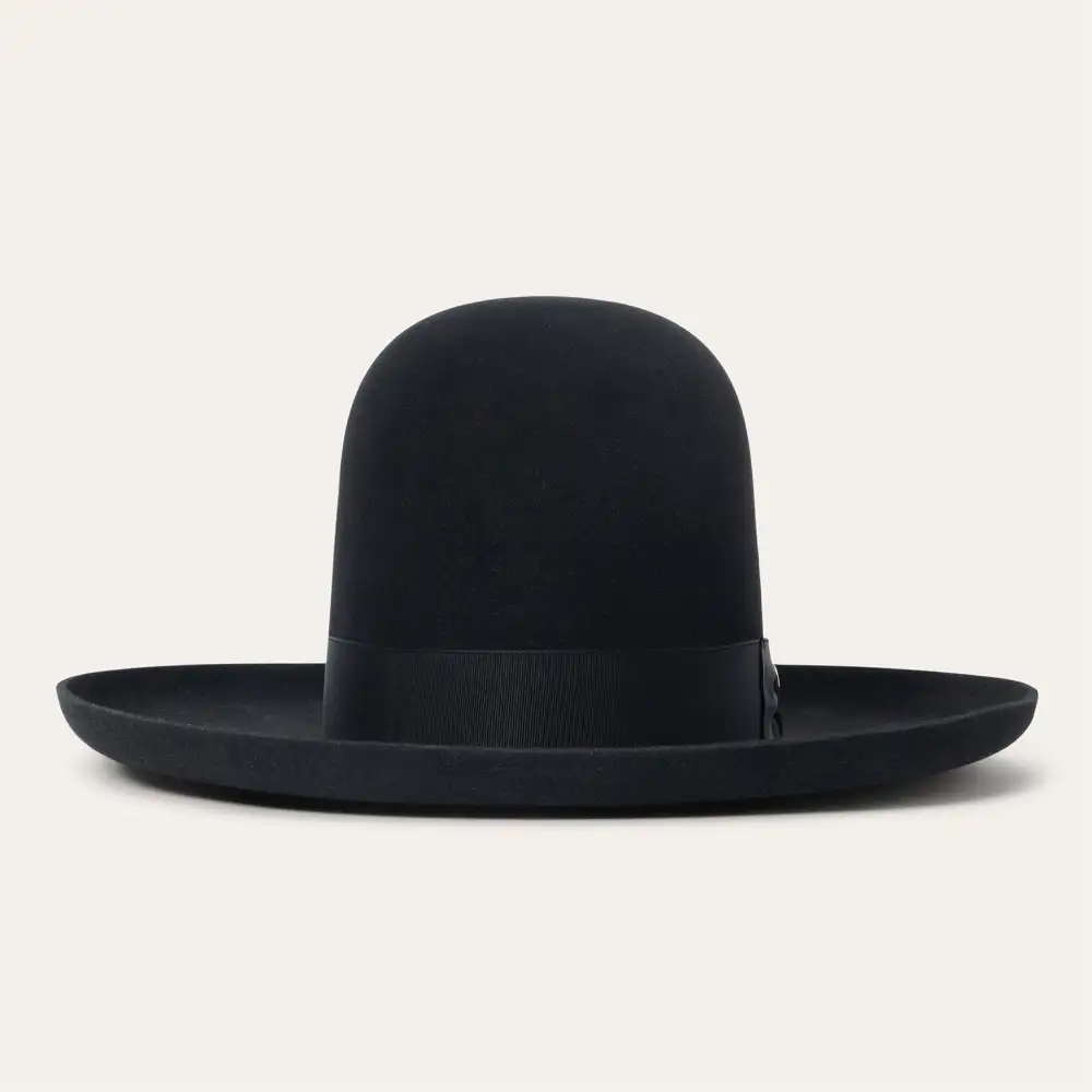 he Boss 1865 is inspired by the legendary Boss of the Plains, the very first western-style hat created by John B. Stetson and often called the first American cowboy hat. Its archival profile features a 4” raw edge brim and a commanding 7” open crown that is intended to be creased by hand—just as early cowboys and ranchers personalized their hats on the frontier. Handcrafted in the U.S.A. from our proprietary 6X quality fur felt blend, The Boss 1865 has a substantial feel designed to hold its shape come rain or shine. It’s finished, like the original Boss of the Plains, with a wide grosgrain band.