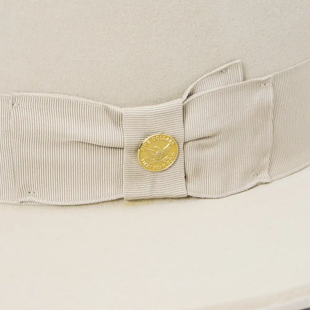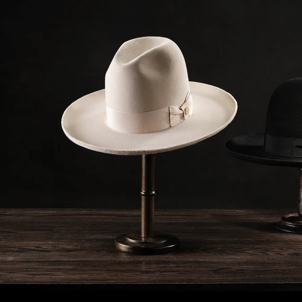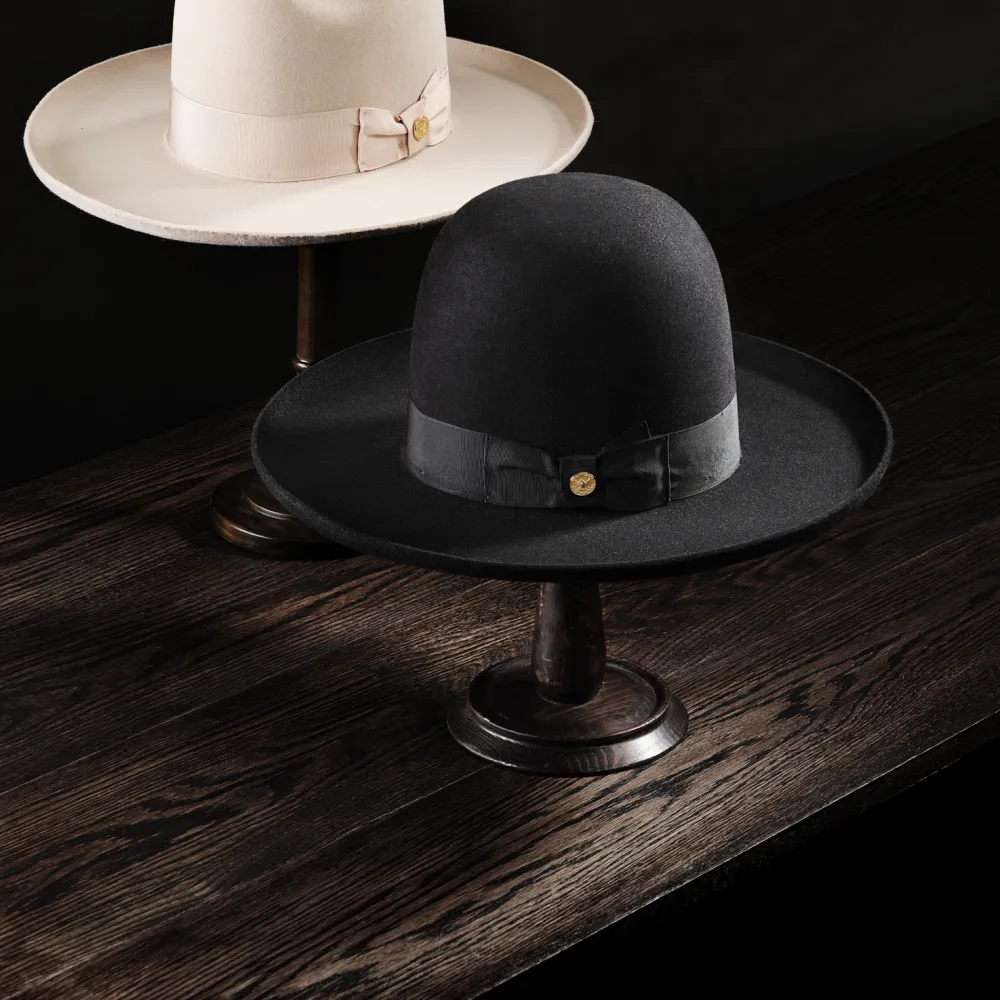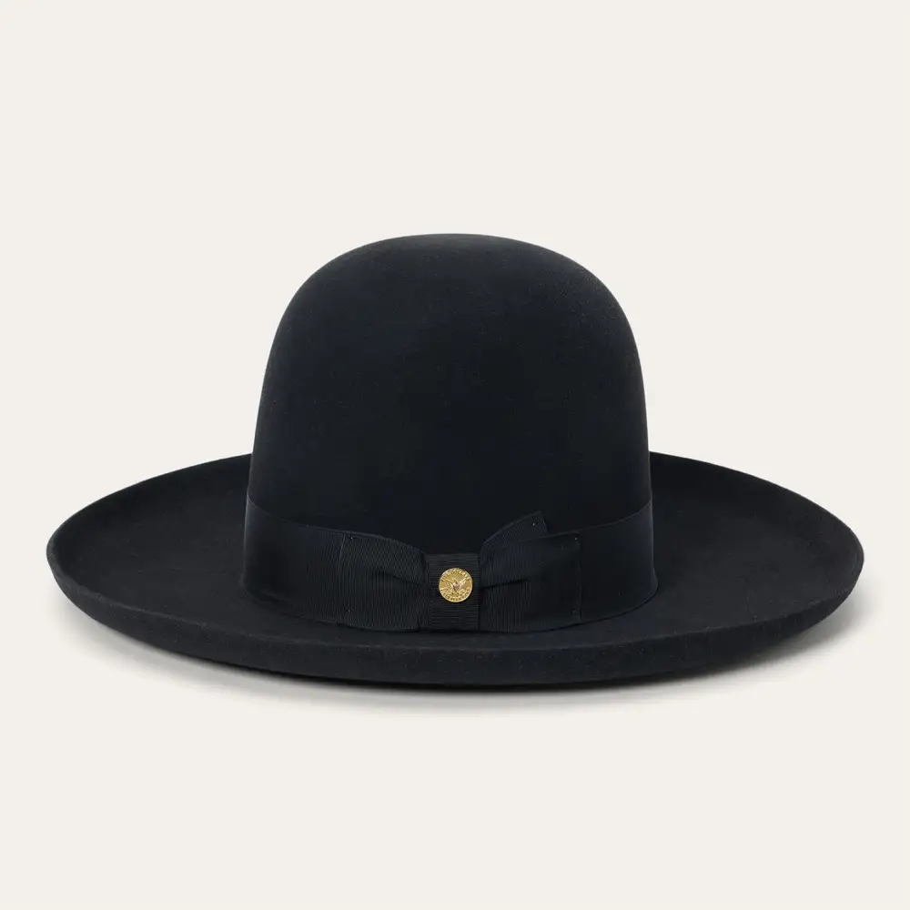 he Boss 1865 is inspired by the legendary Boss of the Plains, the very first western-style hat created by John B. Stetson and often called the first American cowboy hat. Its archival profile features a 4” raw edge brim and a commanding 7” open crown that is intended to be creased by hand—just as early cowboys and ranchers personalized their hats on the frontier. Handcrafted in the U.S.A. from our proprietary 6X quality fur felt blend, The Boss 1865 has a substantial feel designed to hold its shape come rain or shine. It’s finished, like the original Boss of the Plains, with a wide grosgrain band.