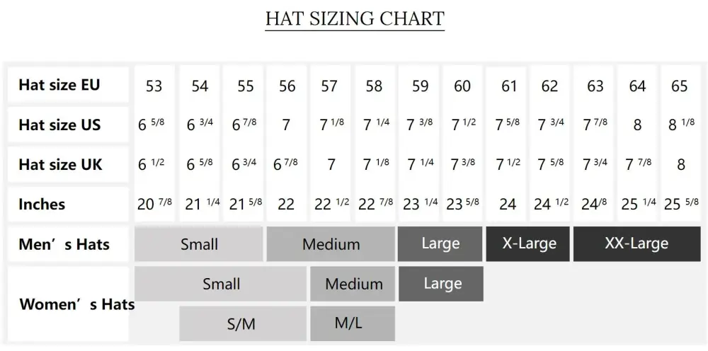 The size of the hat is based on the circumference of the head. In order to determine the proper hat size, you must measure your head.